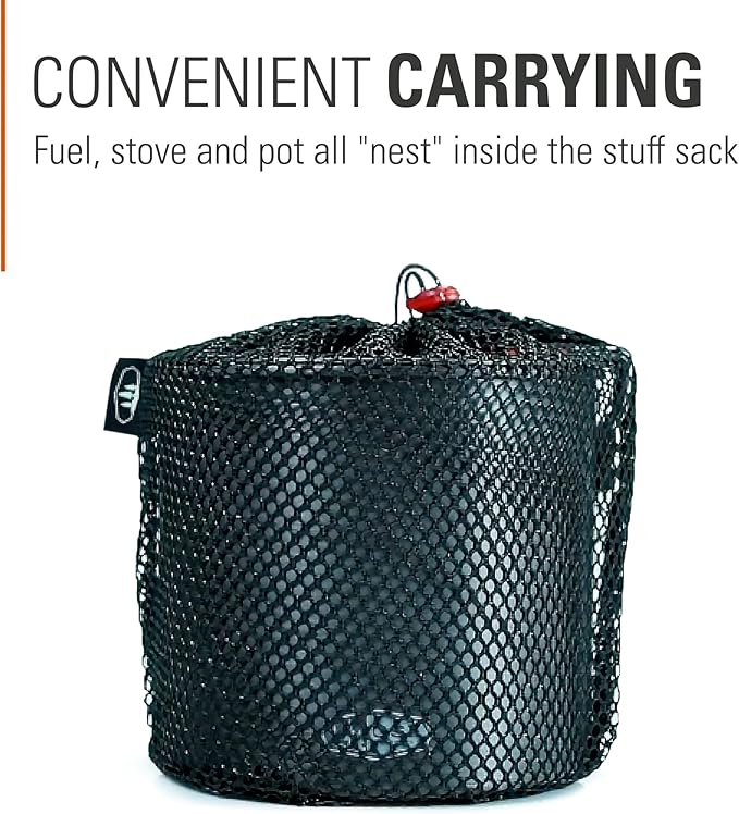 - Molded-in graduations give you consistent measurements every time; Fuel, stove and pot all “nest” inside the stuff sack for convenient carrying