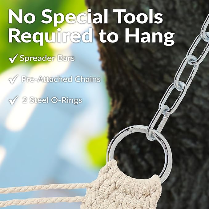 - EASY TO SET UP ANYWHERE: The rope hammock for backyard includes pre-attached chains with 2 steel O-rings so no special tools are required. It can be hung up from trees, poles, or a hammock stand (not included).
