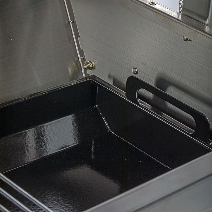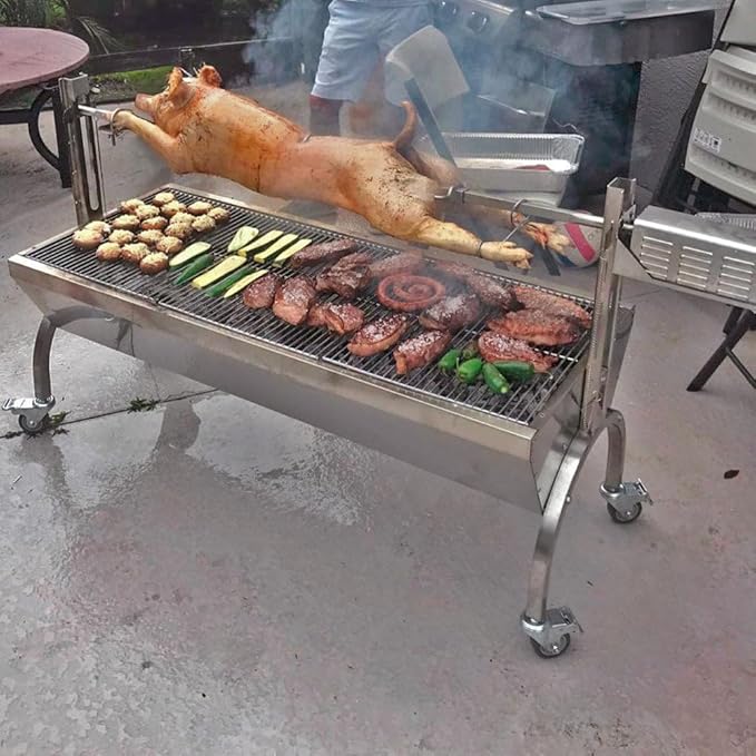 - DURABLE CONSTRUCTION: Made with durable stainless steel, this rotisserie is built to withstand the elements without rusting or corroding. The roaster weighs 73 LB and has an overall height of 42", a depth of 22", a length of 53.75" and four easy to move locking caster wheels.