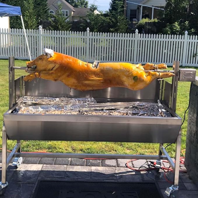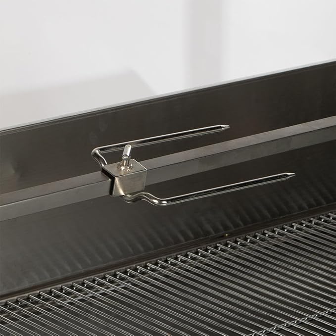 - DUAL PRONG SPIT ROD: This rotisserie features a durable dual-prong spit rod that holds whole pig, turkey, pork shoulder, and more. With a leg bracket, spine fork, and three adjustable tiers, it ensures juicy, tender results. Constant rotation drains fat into a removable stainless steel drip pan for healthier flavor.