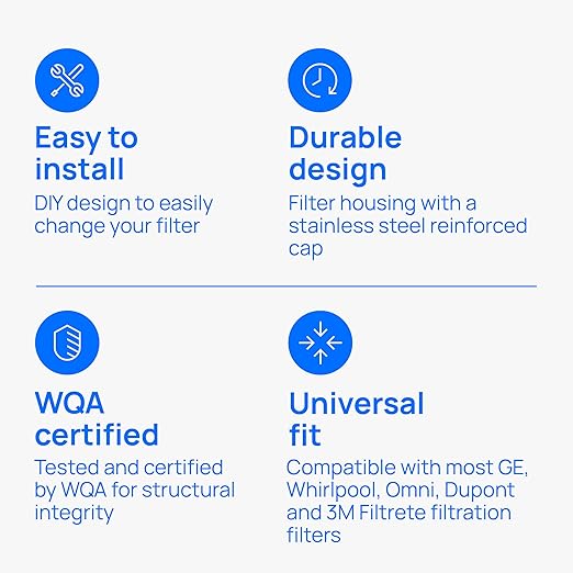 - Reliable, Certified Construction: Certified by WQA/CSA for low-lead compliance and NSF/ANSI standards for structural integrity and material safety. Durable, clear housing enables visual filter checks without disassembly.