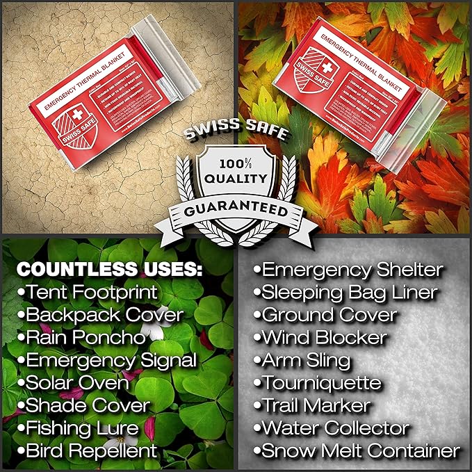 - BONUS SPACE BLANKET INCLUDED: With every purchase, receive a bonus space blanket - a smaller, more compact version of our emergency Mylar thermal blankets. This bonus blanket is perfect for keeping in your glove compartment, hiking backpack, or emergency go-bag. It offers the same heat retention and waterproof benefits in a more compact size, ensuring you're prepared for anything, anywhere, anytime.