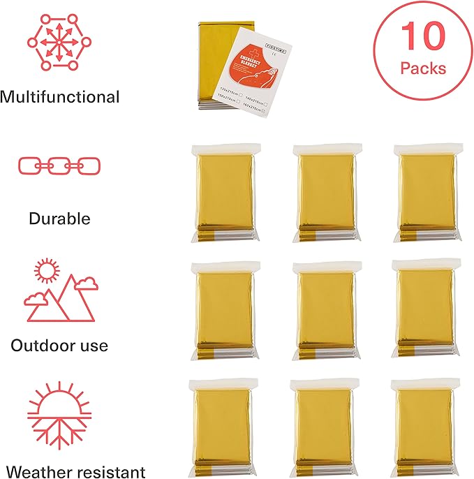- Multi-pack Versatility: With 10 mylar sheets included, this thermal emergency blanket reusable pack offers unbeatable versatility. Share with loved ones, or keep extra emergency thermal blankets on hand for prolonged crises.