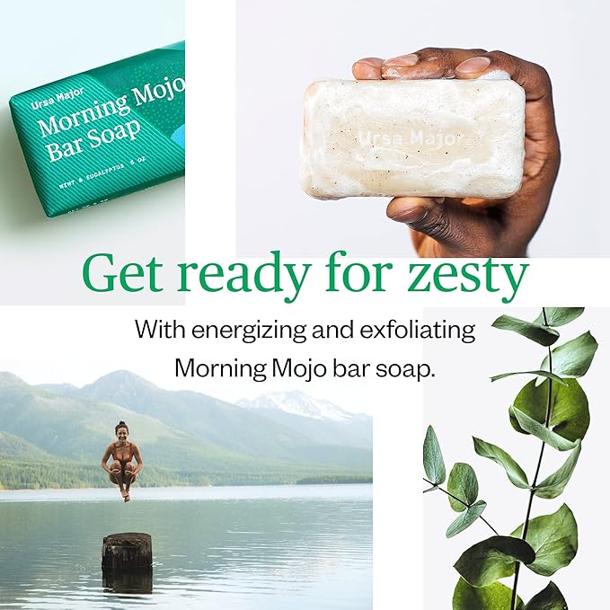 - URSA MAJOR MORNING MOJO BAR SOAP - This energizing natural bar soap gives you a delightful clean while exfoliating, soothing and hydrating your skin. Its invigorating aroma, creamy lather and gritty texture will leave you bright-eyed and bushy-tailed, yearning to tackle the day.