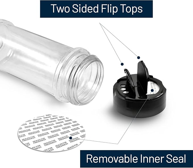 - Easy to Use: The lids of our spice jars are two-sided flip tops for shaking or pouring spices. There is a removable internal seal under the lid of the jar to keep the product fresh and delicious.