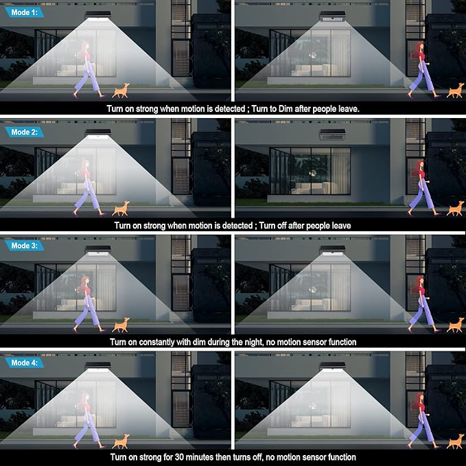 - 4 working modes to handle all of your lighting needs in Securoad solar lights for outside daylight. Dimmable-Bright mode, Off-Bright mode, Constant lighting mode and Emergency lighting mode. You can cycle through them by just pushing the button shortly each time. Our solar lights for outside upgraded 120° Detection Range. Built-in PIR motion induction of our solar lights can detect up to 120 degree with a longer sensor length of 26 feet thus provides a broader range of lighting.
