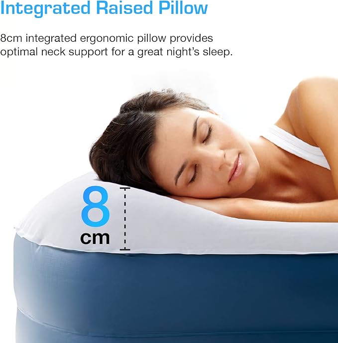 - BUILT-IN PILLOW: This blow up mattress with a built in pump also features a unique 3-inch built-in raised pillow for improved head and neck support, and improved spinal alignment for bed-like comfort throughout the night.