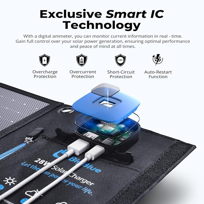 BigBlue Portable Solar Charger 28W with Digital Ammeter,25.4% High-Efficiency, USB-A/USB-C Ports, Folding Waterproof Solar Panels with Carabiners for Camping, Backpacking, Phones, Tablets, Power Bank