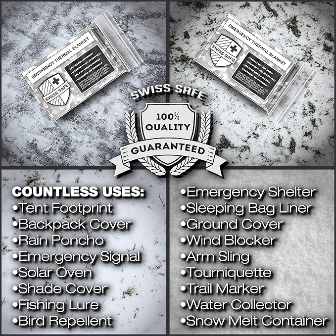 Swiss Safe 4 Pack Mylar Emergency Blankets for Survival - Compact & Insulated for Cold Weather - Designed for NASA, Outdoor, Running, Camping, Survival, First Aid Car Kit - Winter Camo, 4 Pack
