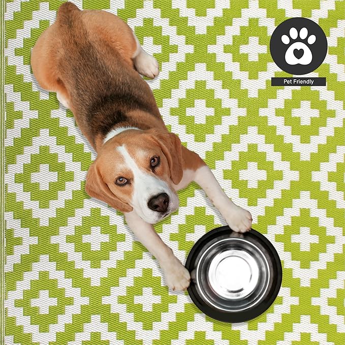 FH Home Outdoor Rug - Waterproof, Fade Resistant, Reversible - Premium Recycled Plastic - Geometric - Patio, Porch, Deck, Balcony - Aztec - Green & White Crease Free - 5 x 8 ft