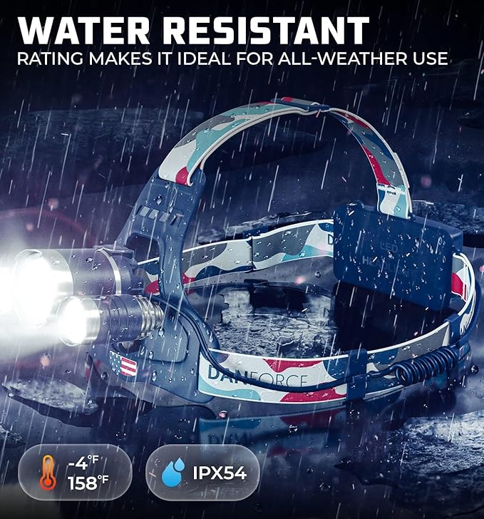 - ALL-WEATHER READY – DanForce head lamps are built to withstand all work and weather conditions, from extreme heat to bone-chilling cold. Plus, the air-tight rubber sealing protects the LED headlamp rechargeable battery from dust, ice, and water, for ultimate dependability.