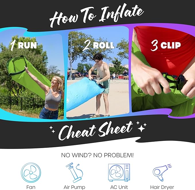 - WIND OPTIONAL SET UP: Setting up the Nevlers Inflatable Sofa is as easy as 1-2-3! Simply run a few feet, roll it up, then clip it to have your outdoor couch ready in no time. No wind? No worries! Even if there's no breeze, you can use a fan or air pump to inflate our inflatable chairs for adults & kids. When it's time to pack up, deflate & fold the portable beach chair into the drawstring bag for lightweight storage. No need to lug around bulky seating with our air hammock banana chair .