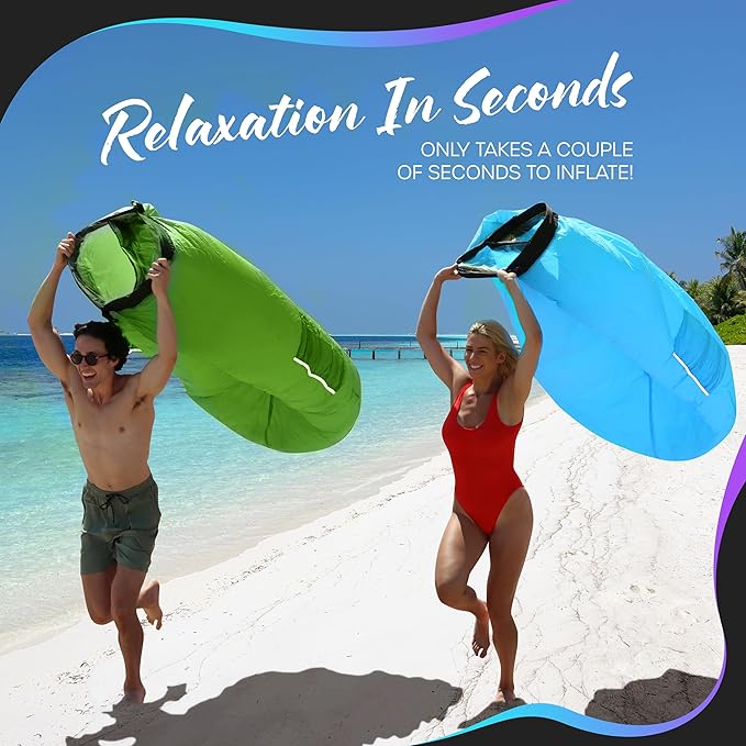 - INFLATABLE LOUNGE CHAIR FOR ON-THE-GO: With our blow up couch for adults & kids, pack light & relax anytime, anywhere! Use our inflatable couch for camping , comfort at the beach or under the stars, a backyard barbecue, relaxing by the pool, an outdoor adventure, a pet bed & much more. From music festivals to firework shows & picnics in the park, you'll have the adaptable travel hammock you need. Take convenience with you wherever you go with the Nevlers Blue & Green Air Chair Inflatable Set!