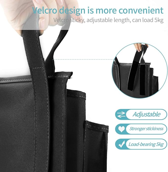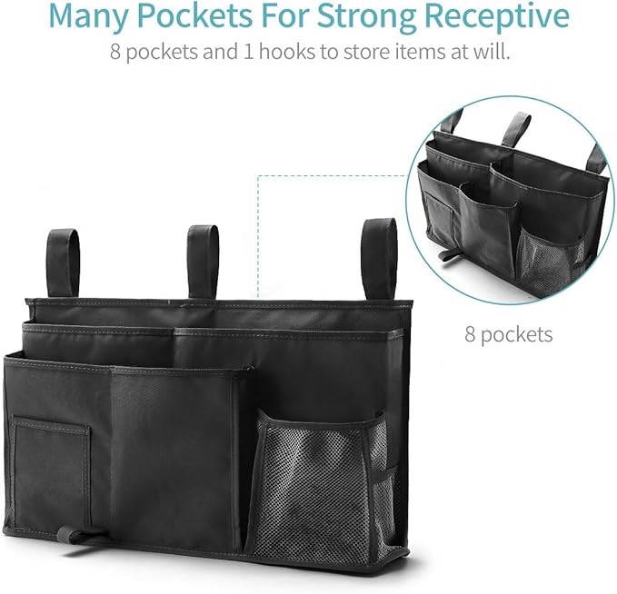 - GOOD QUALITY – Made of 600D Waterproof Oxford Fabric with reinforced stitching, easily attaches to bed rail using three adjustable heavy duty velcro straps, keep the bedside caddy securely in place, durable enough to withstand heavy weight. Easy to use, no assembly required.