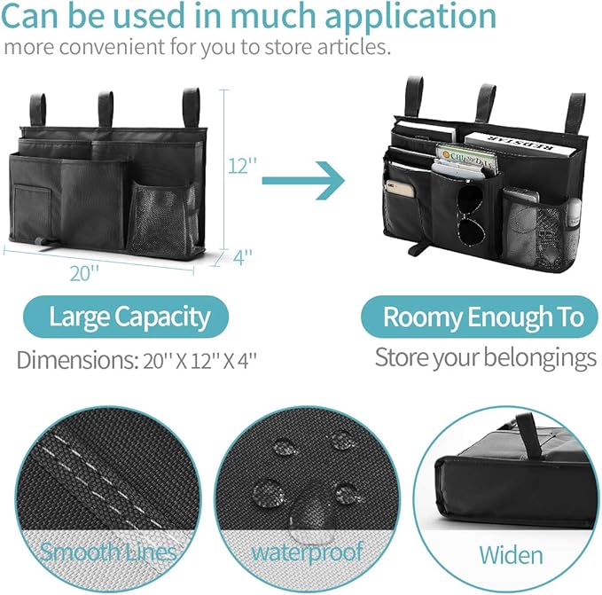 - PERFECT DEMENSIONS - The size of this bedside storage caddy bag is 20L * 12W * 4H inches, works great on headboard or any bed rail. Perfect for top bunk bed, college dorm room, hospital bed, baby crib, wheelchair, chair, regular bed with rails, camp or traveling. Use as a bunk bed caddy, bed storage pocket, bunk organizer for camp, bedside caddy for dorms, footboard bedside organizer caddy, college dorm room accessories, hospital bed organizer.