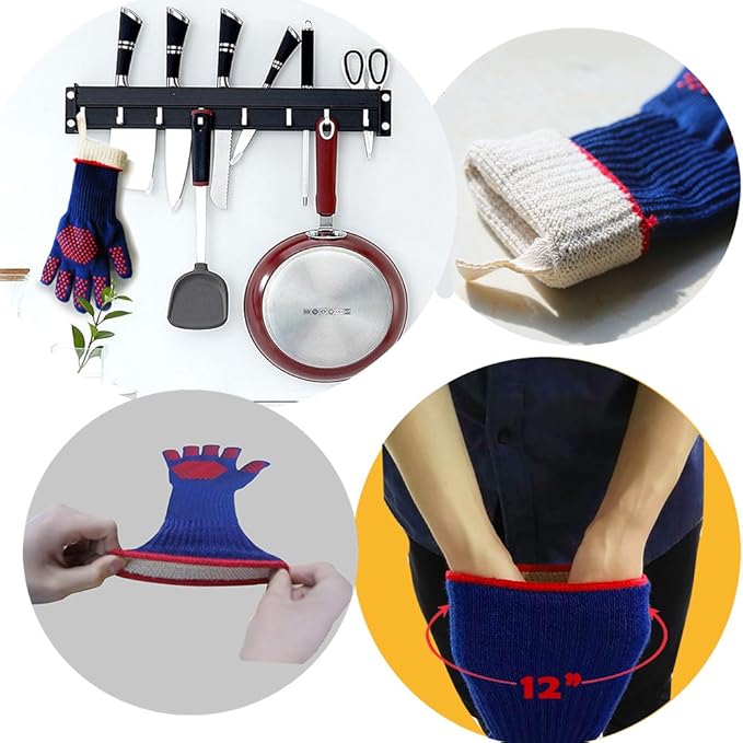 - 【Non-Slip】These heat resistant gloves covered with food-grade silicone anti-slip dots offer excellent grip,the oven mitts with fingers design make you can flexible hold different grilling forks, barbecue tools, pizza stone, dutch oven hot handles, hot pans holder, ovenware, etc.