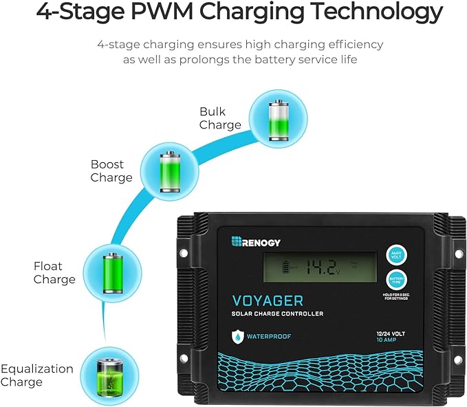 - 【Remarkable efficiency】Renogy solar panels using grade A plus monocrystalline solar cells. Advanced smart PWM technology charge controllers ensure charging efficiency and safety.