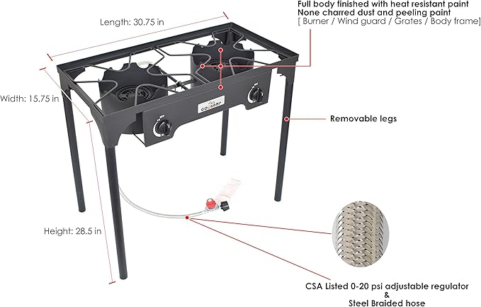 - POWERFUL: Total output 110,000 BTU. Produced by two 55,000 BTU cast iron burners. Includes CSA Listed 0-20 PSI adjustable regulator and steel-braided hose