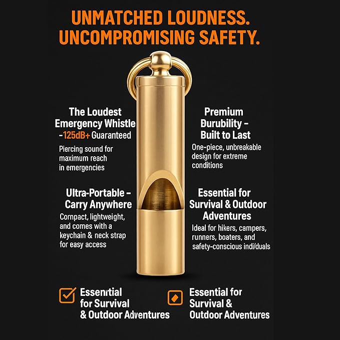 - UNBREAKABLE IN EXTREMES Forged from premium brass with military-grade corrosion resistance, built to endure tornado debris, floodwaters, or crushing pressure. Rustproof, submersible, and grit-proof performs when survival hinges on one tool. Audible through pounding rain, howling winds, or collapsing structures.