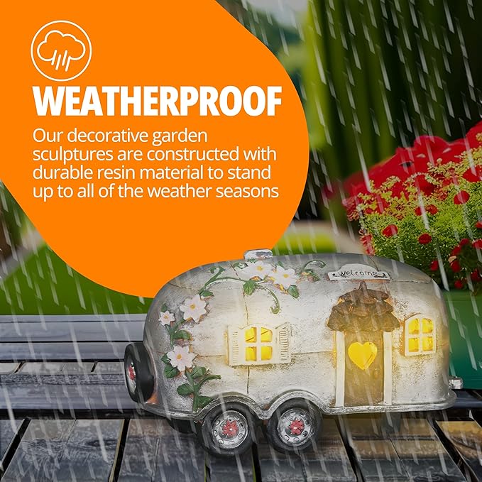 - CAMPER TRAILER GARDEN STATUARY: Add a touch of fun and enchantment to your garden decor with the Exhart Vintage Camping Trailer Solar Garden Statue; crafted from durable resin and meticulously hand painted, these solar garden decorations are an excellent way to add whimsical charm and soothing accent lighting to your outside garden, front porch, patio, lawn, or yard
