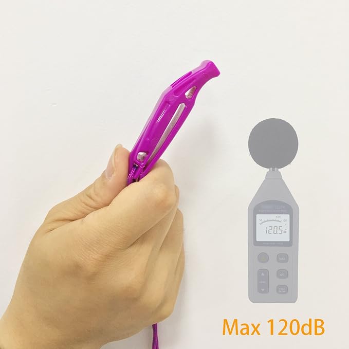 - 120 DECIBLE, two sound chambers design, high pitched noise maker, audible over 1 mile, easier to be heard, work great as signal whistle.