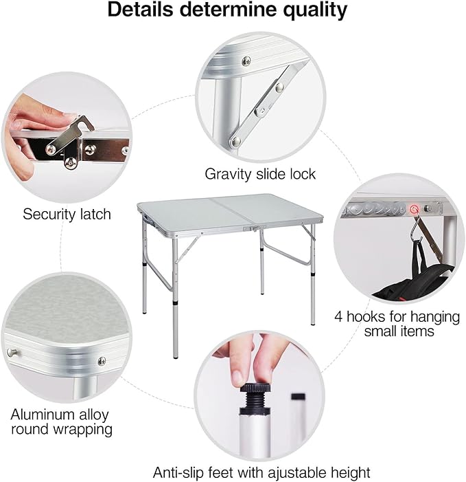 - 【Sturdy and Stable】 Finished with added U-shape side support and secure latch, ensures the aluminum camping table stable enough in use.