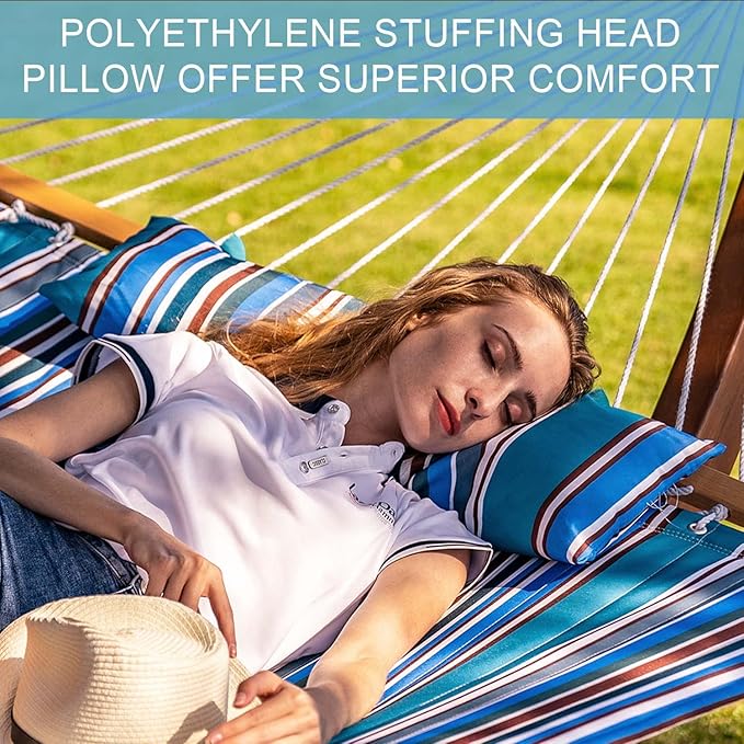 - SUPER COMFY: The double-layered quilted polyester with inner polyester padding and a polyethylene stuffing head pillow offer superior comfort. This quilted hammock can give you a cloud-like comfortable experience. Lying on it is like being in a warm embrace. No matter it's in summer or winter, this hammock will always be your first choice for relaxation.