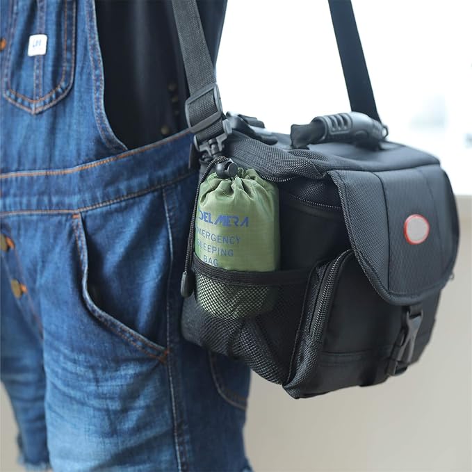 - ULTRA LIGHTWEIGHT & COMPACT SLEEPING BAG—Delmera’s emergency sleeping bag's dimension is 3.08 ft x 6.73 ft, weighs just 4.6oz. Small enough to fit in the palm of your hand. The survival sleeping bag comes rolled up inside handy nylon stuff drawstring bag sack so you can store it in bug out bag,camping gear,glove box,emergency bag in your car