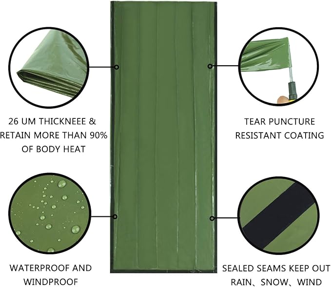 - INCREDIBLY PACKABLE AND PROTECTION AGAINST RAIN, WIND—Can carry this sleeping bag with your survival kit everywhere you go without weighing yourself down. Heavy-duty aluminized PE interior material can resist rain, wind, snow and other external impact. In the bad storm, can effectively keep you stay warm