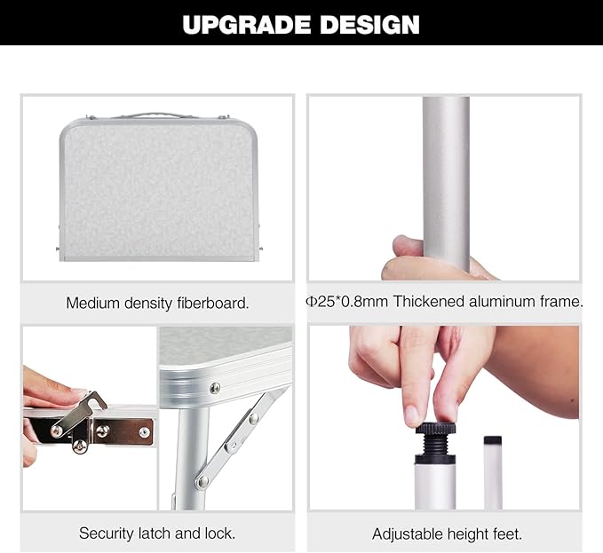 - 【Sturdy and Stable】 Finished with added U-shape side support and secure latch, ensures the aluminum camping table stable enough in use.