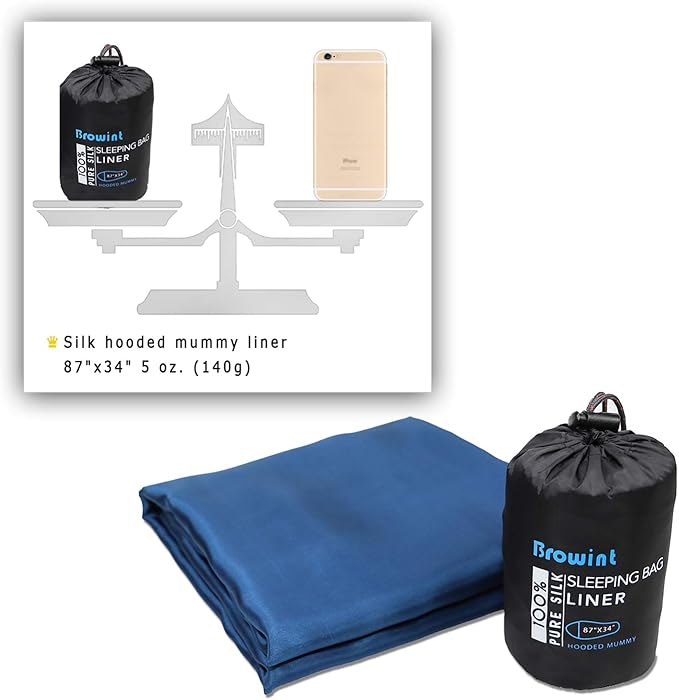 - MUMMY WITH HOOD, SUPER LIGHTWEIGHT: 87“X34” mummy with hood, suitable for camping sleeping bags. There’s generous space for one person to move freely. This liner is compacted in a very small ripstop nylon carry case, weight only 5oz. (140g). With an attached hook on the carry case, you can link it up with the liner after taking the liner out, you can find the small carry case easily.