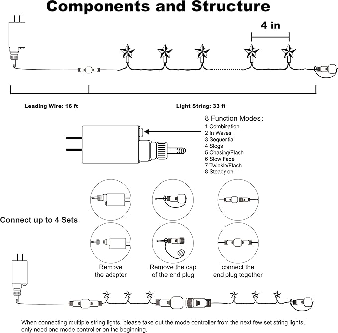 - 8 Modes : 8 Functions to fit different occasions, moods, feelings, holidays, festivals, anniversaries, etc. Satisfied different requirement. (Combination, In waves, Sequential, Slow Glow, Chasing/Flash, Slow fade, Twinkle/Flash, Steady on)