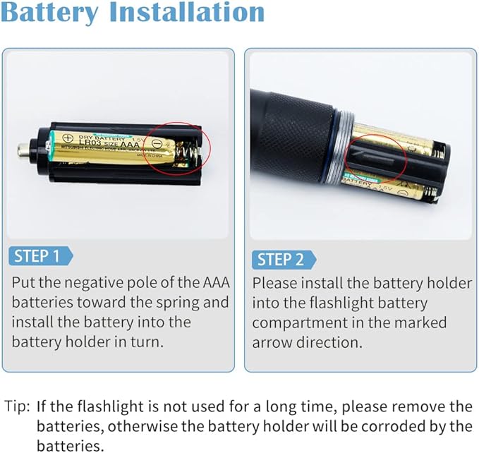 - 【 Sufficient Accessories Included 】Unlike other flashlights, we offer a comprehensive set that includes 2 flashlights, 2 battery tubes for rechargeable batteries, 2 battery cases for AAA batteries, and 2 hand straps.Supported Battery Type: Our two-in-one design offers flexibility with both rechargeable batteries and AAA batteries. Each flashlight requires 3 x AAA batteries. (Batteries not included.) Note: If not in use for a long time, remove the batteries to avoid corrosion