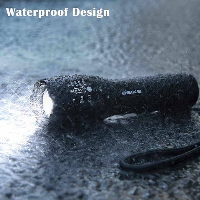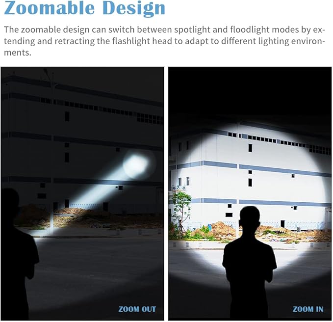 - 【Small Yet Powerful Flashlight】With 5 modes and a zoomable design, this flashlight is perfect for any situation.Simply half-press the tail switch to cycle through the modes: High, Medium, Low, Strobe, SOS. The zoomable feature lets you easily switch between spotlight and floodlight by adjusting the flashlight head, adapting to different lighting needs.Ideal for camping, emergencies, hiking, biking, travel, hunting, outdoor activities, home use, night walks, car repairs, or power outages