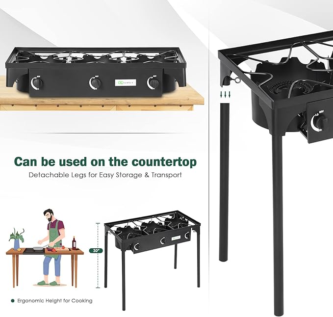 - Detachable Legs: This 3 burner propane gas cooker weighs only 33 lbs, making it more convenient to transport. Remove the legs of the outdoor stove for effortless car-loading, adding excitement to your camping or picnic adventures.