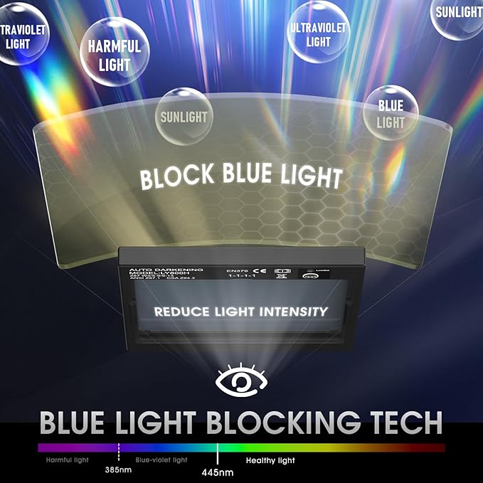 - Advanced Eye Protection with Blue Light Blocking Technology: This welding helmet features cutting-edge Blue Light Blocking outer lens, shielding your eyes from harmful blue light during welding, protects your eyes by filtering out most of harmful high energy blue light rays while letting through the less harmful portion of the blue light spectrum. This ensures long-lasting eye comfort and safety, making it ideal for extended welding sessions