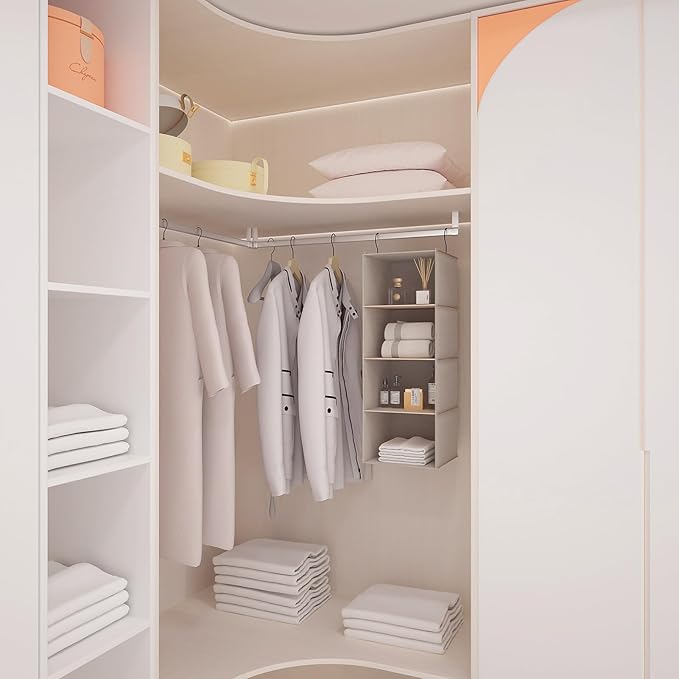 Hanging Closet Organizer and Storage, Foldable 4-Shelf Wardrobe Clothes Shelves Organizer, Imitation Linen Fabric, Beige Houndstooth