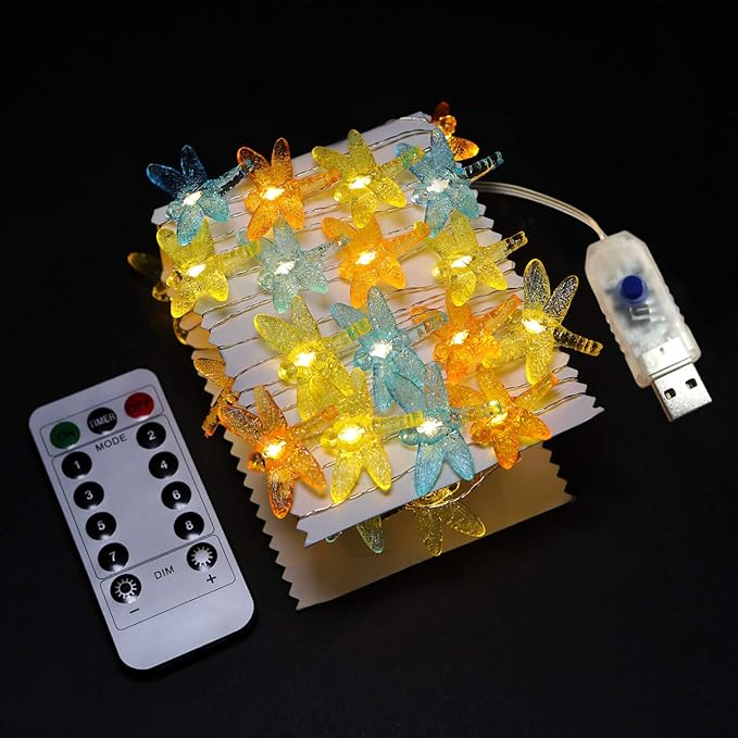 Dragonfly Decorative String Lights, 18.7 Ft 40 LED USB Plug-in Copper Wire Dragonfly Fairy Lights for Various Decoration Projects (Warm White, Remote Control with Timer)