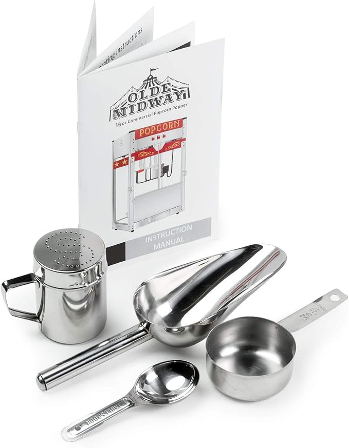 - Stainless steel accessories included: Popcorn machine is paired with a 1/2 cup measuring cup, tablespoon, popcorn scoop, and salt shaker.