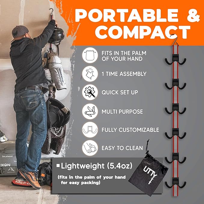 UTTY Hanging Multipurpose Portable Hockey Drying Rack - Durable Gear Keeper & Sports Equipment Organizer - 6 Durable Adjustable Hooks Support Light to Heavy Weight for Home, Travel & Outdoor Use