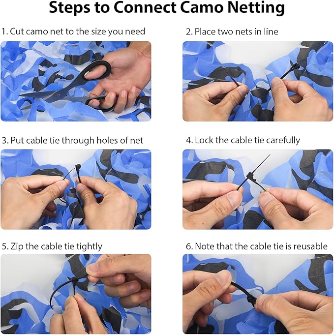 - Free Cutting: Camouflage netting can be easily cut to any size; you can use the included zip ties to fix it. Camo net can match with a variety of background colors, so you can observe the surrounding terrain well, providing maximum concealment in the field