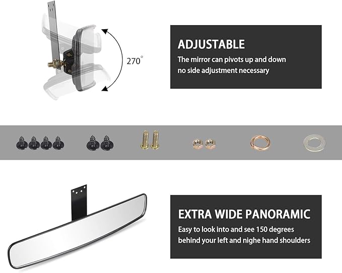 - Extra wide convex rear view mirror with free adjustment viewing angle, gives the driver a 150 degree panoramic view, which allows for the best visibility of everything behind the vehicle, helping to reduce blind spots and ensure your driving safety