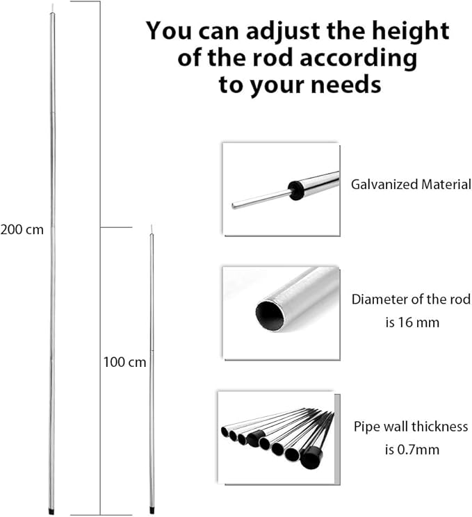 - ➤【Precise Size】 The diameter of the pole is 16mm, the thickness of the rod wall is 0.7mm; each rod is composed of 4 short bars, after 4 section assembled the total size is 2 meters (200cm). You also can adjust the height according to your needs. The shortest size of 2 section is 1 meters (100cm).