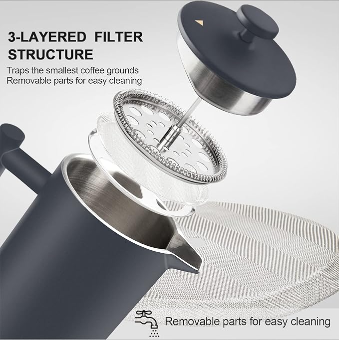 - Best Filter Way:3 layer stainless steel filter structure traps the smallest coffee grounds to produce an exceptional full-bodied flavor coffee. French press stainless steel comes with two extra filter mesh