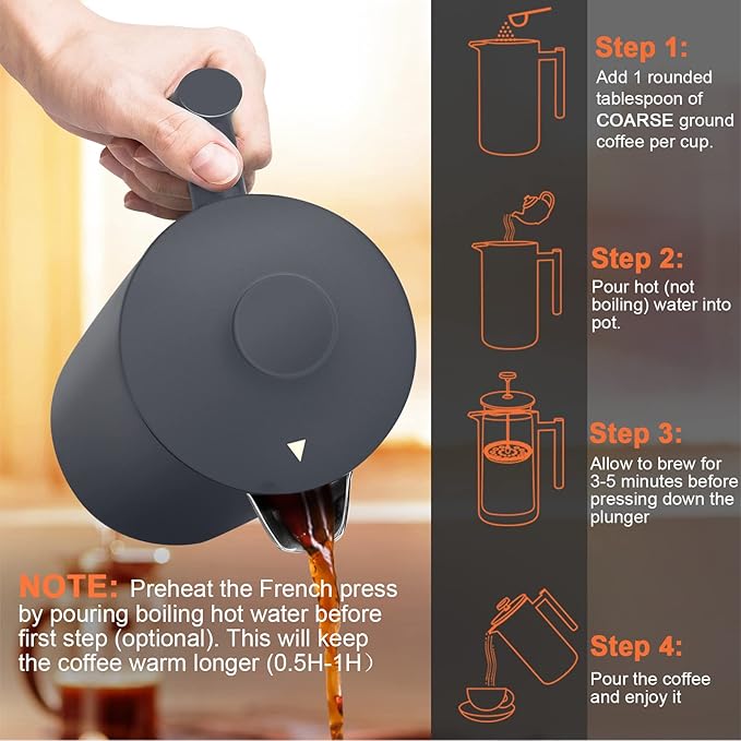 - Perfect Brew & Stay Hot:34 OZ Large capacity double-wall stainless steel french press coffee maker will keep your coffee hot for 60 minutes longer than other steel and glass models. Turn the symbol (▲ ) away from the spout for superior thermal retention. Take your time and enjoy delicious coffee