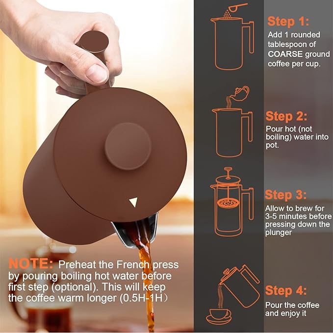 - Perfect Brew & Stay Hot:34 OZ Large capacity double-wall stainless steel french press coffee maker will keep your coffee hot for 60 minutes longer than other steel and glass models. Turn the symbol (▲ ) away from the spout for superior thermal retention. Take your time and enjoy delicious coffee