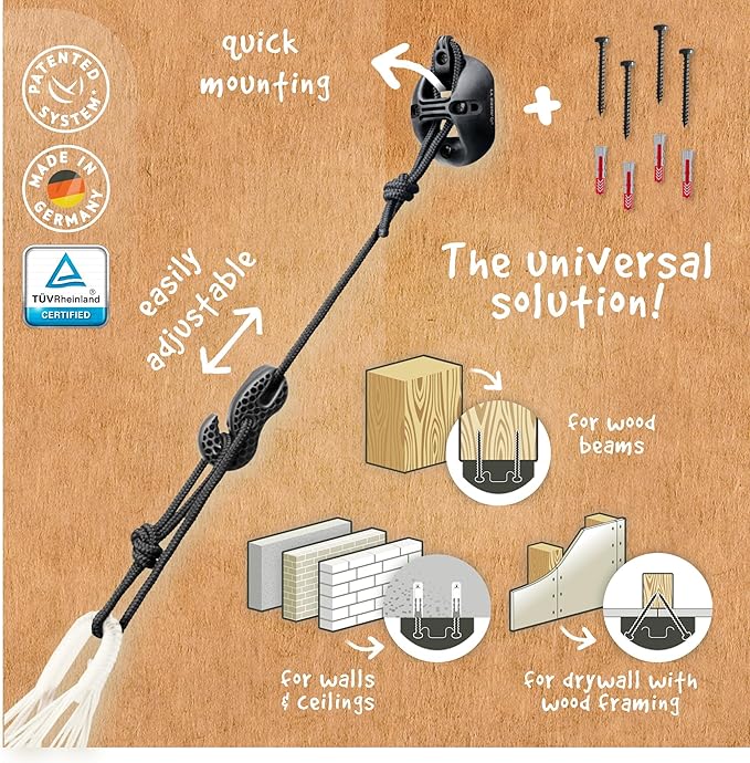 - VERSATILE WALL SUSPENSION: Our hammock comes with a suspension kit, making it suitable for beams wider 3.5 inches, ceilings with wooden studs, and solid masonry. Easy to install with our patented MultiSpot’s four-screw mounting system to keep your hammock locked in place and our patented SmartHook for hassle-free length adjustment.