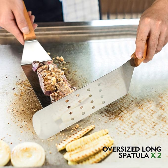 - 🔥【Multipurpose Outdoor or Kitchen Cooking Kit】2 Oversized griddle spatulas, great for flipping beef cubes, fried egg, rice, noodle and vegetables. 2 Regular size grill flippers/turners (can be use as shorter spatulas) with 3-sided bevel cutting edge, great for turning burger,pancake and cutting bread,meat and sausage.