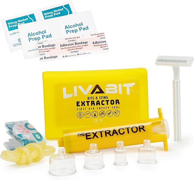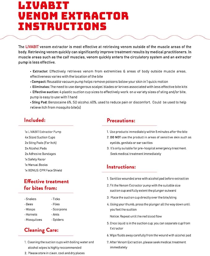 - Bonus CPR MASK Included: Kit includes LIVABIT extractor pump s, alcohol prep pads, antiseptic pad and small tourniquet to slow/stop blood circulation + Instruction Manual + Razor