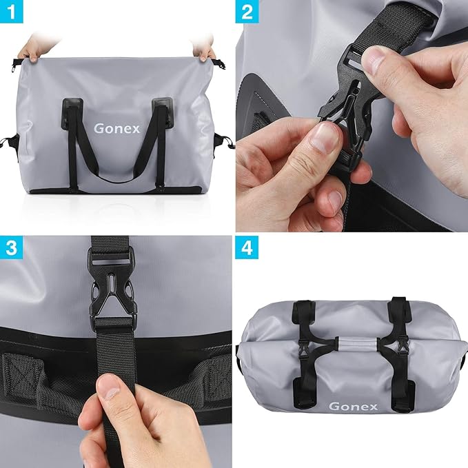 - Highly waterproof: Gonex military duffle bag is made of durable high-strength PVC, which is completely waterproof & snowproof. The opening can be closed with velcro closure and easily rolled at the top. Roll it 3/4 times and secure it with the strap to keep all your items perfectly dry